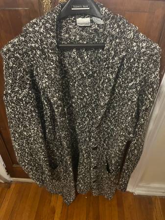 Newport News white and black Large Acrylic/Wool jacket with hood and buttons. Length to knee.