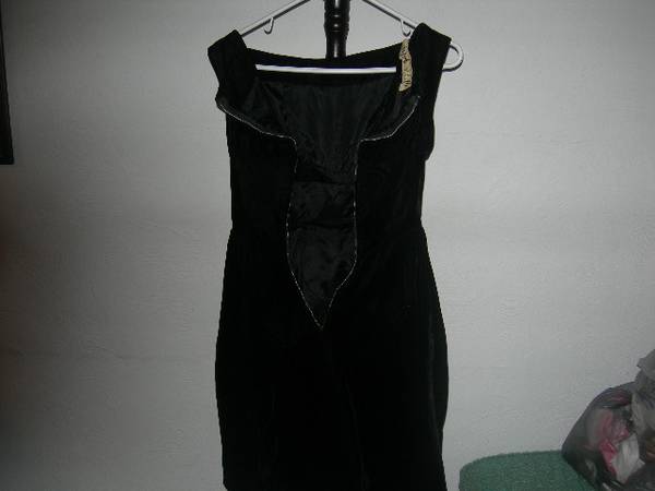 I believe it is probably from the 1960's maybe older. It has two zippers and a bow in the front and has a velvet type of fabric, with an unusual flap or split in the front skirt area.