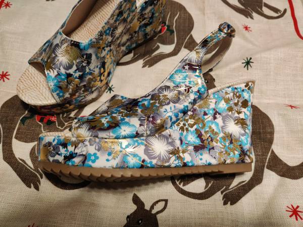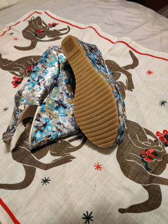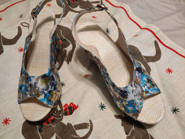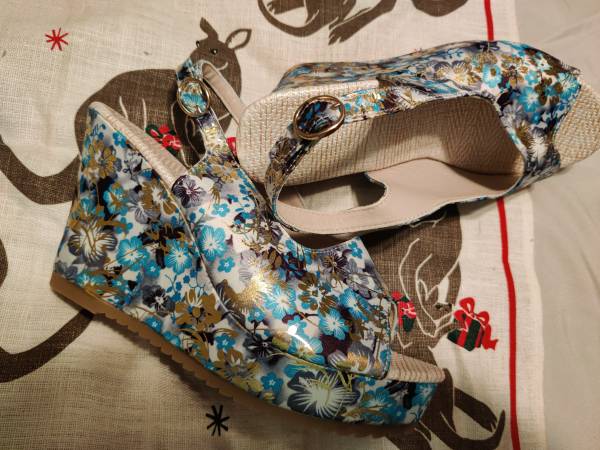 Lastly the adorable blue floral high wedge sandals. Great for your next cruise if you are still lucky enough to wear heels. Size 6.5m never worn $10.00