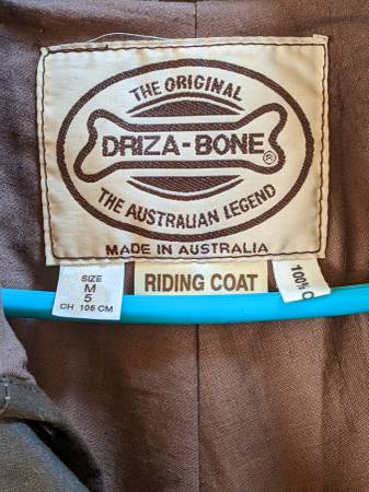 This is an original Driza-Bone Riding Coat, made in Australia, size 5 (equivalent to a unisex medium, CH 105cm). Constructed from premium 100% cotton heavy weight wind and water resistant oilskin. Made in Australia. It features wide storm flaps, deep front patch pockets, and a buttoned front with additional throat latch closure, characteristic of the brand's equestrian and outback functional wear.