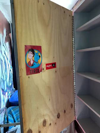 I built this for my son when he was 12 or so for a custom industrial sort of bedroom. I have not outgrown it, but he has. I have a few other custom elements I will be listing, an overhead garage type steel door for a 30 inch doorway and some old school lockers.