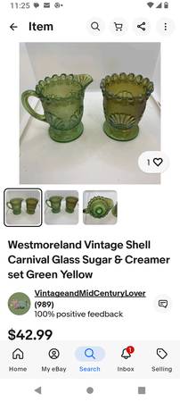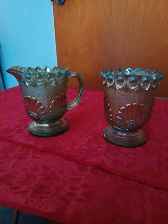 Beautiful green Carnival Glass sugar and creamer with the shell pattern and hobnail. Sells for $43 on Etsy. $20. Call text or email Peggy at .