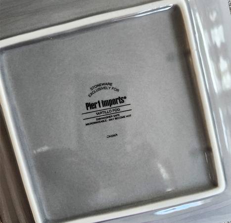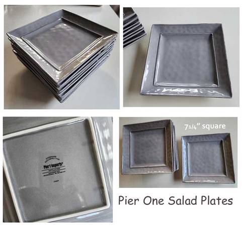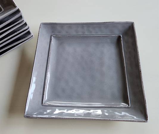 9 gray plates used a handful of times. Nice accent with other dinnerware. No chips or cracks. 7 1/4" squares