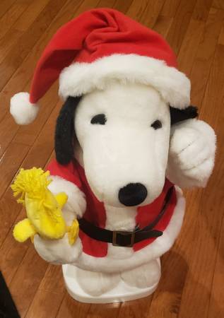 "Santa's Best" 20 " Tall Animated Santa Snoopy & Woodstock Figure From PEANUTS 1997. Includes a 12 volt powered adaptor (No Batteries). Snoopy moves his arms and head while holding Woodstock in one hand. Original box has been repaired and is included, all paperwork also included. INDOOR USE ONLY.
