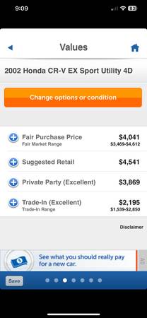Looking to sell a 2002 Honda crv ex sport motor and tranny strong exterior and interior great shape ac , heat , radio working order 4 cylinder great on gas , 215 k miles clean title 1 owner , well...