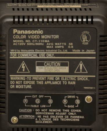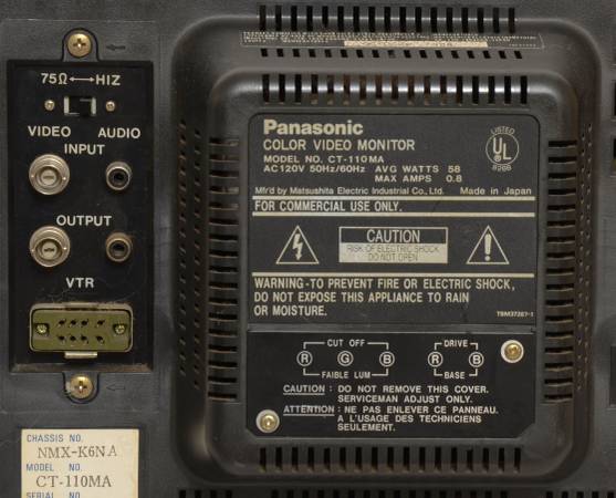 Panasonic CT - 110MA 13 Inch Monitor. I no longer have anything I could plug into this monitor to test it. As you can see in the first photo the screen did light up when I turned it on.