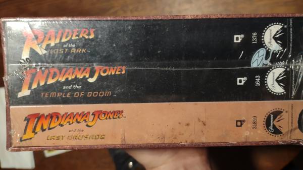This is a Indiana jones three box set . Still in the original plastic wrap. Please ask any questions you may have.