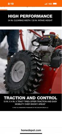 24 in. clearing width and 20 in. intake height powers through up to 12 in. of snow and designed to throw up to 40 ft. of snow