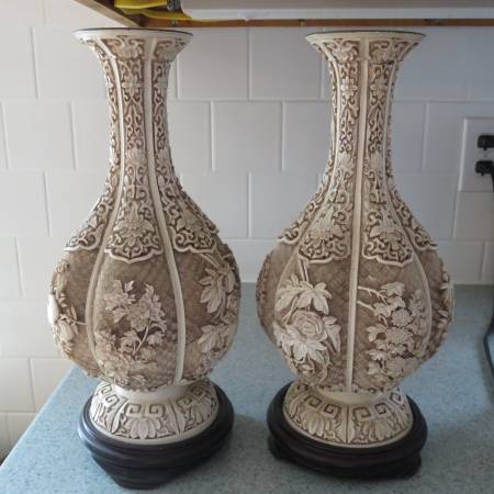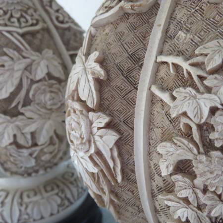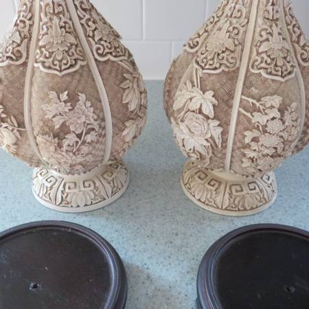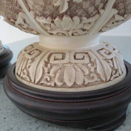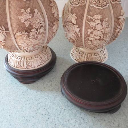 Selling 2 Arnet imports Ivory Dynasty Vases from the early 80's. They are in excellent condition and come with wooden bases. Asking $75 for the pair.