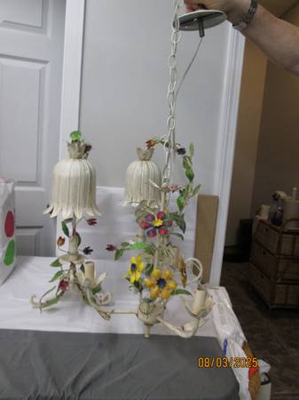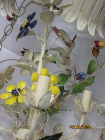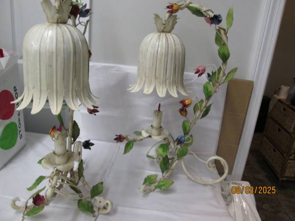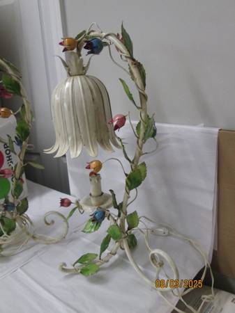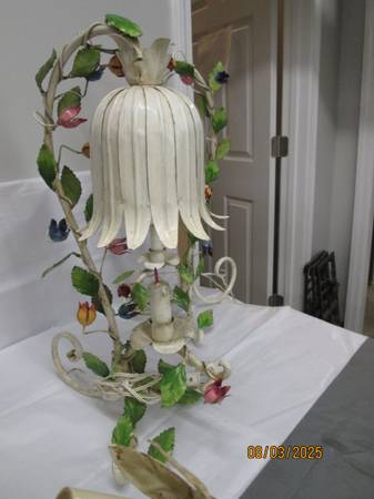 I have a pair of VINTAGE FLORENTINE TOLE TULIP FLOWER TABLE LAMPS for sale. These are in overall good condition but need to be cleaned. I am selling the pair for $799.00. I also have the matching ceiling lamp for sale at $299. We are at 1122 Wellington Ave Cranston RI. If you are interested, please call show contact info