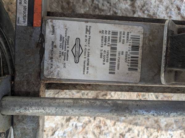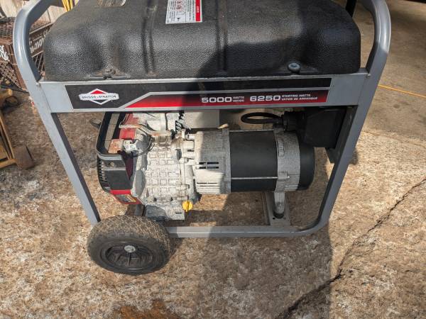Briggs& Stratton generator 5000 w 6250 starting Watts. I inherited it. I already have a generator and I don't need two. Runs and works as should $150