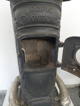 Crawford Tropic 110 late 1920's coal stove. Nickel accents. Does not have original feet but will include the feet shown from a Tropic 112. Good original condition. Back stove pipe dented in. Decorative purpose only. Any questions please ask . Thanks.