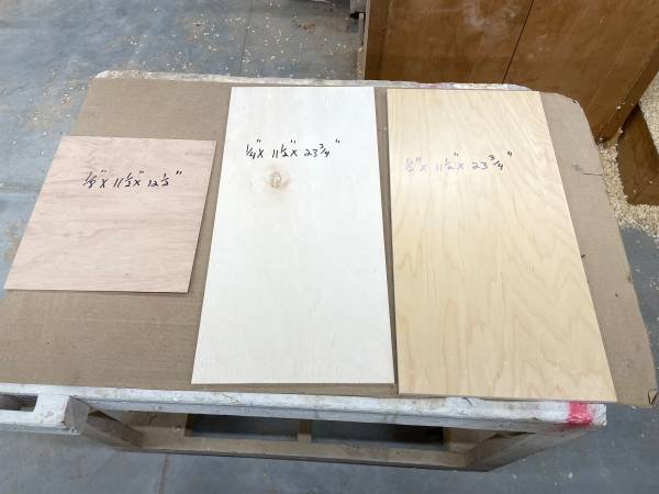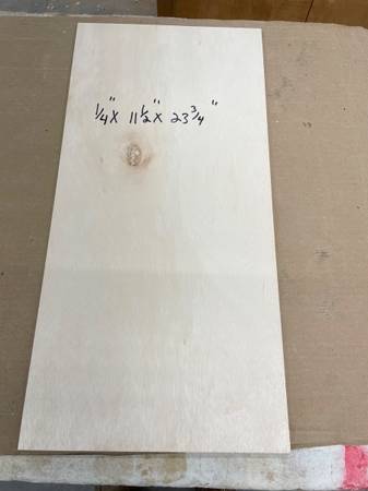 Have about 100 pieces of each: 1/2" maple plywood clear finished on one side, about 11-1/2" wide x 23-3/4" long ; 1/4" lauan plywood about 11-1/2" wide x 23-3/4" long ; 1/8" lauan plywood about 11-1/2" wide x 12-1/2" long. sizes may vary slightly. must take all. $100