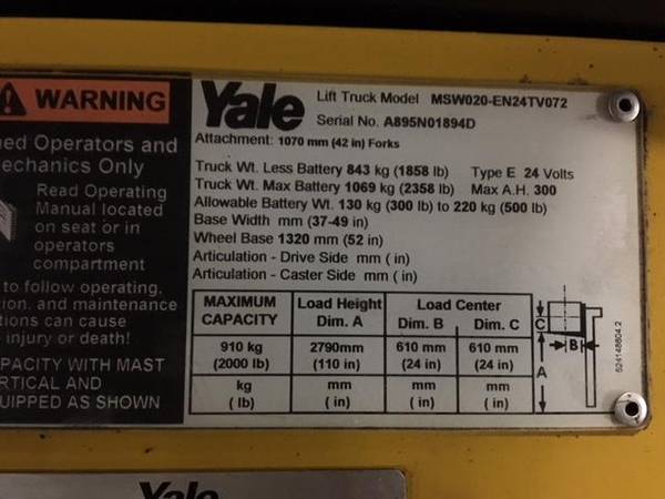 Used Walkie Straddle Stacker Model # MSW020 GOOD BATTERIES 24V (4 x 6V) on board charger 2000# lift capacity 110" Lift Height Year 2006 This machine is in excellent shape and functions perfectly....