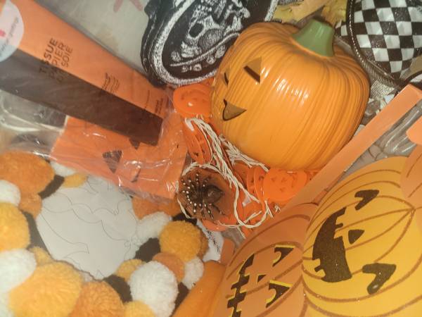 A large tote filled with Halloween decor. Pumpkins, lights, skeletons, ribbon and more. Including the carrier tote. $25. Location Narragansett Cash and carry.