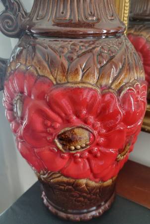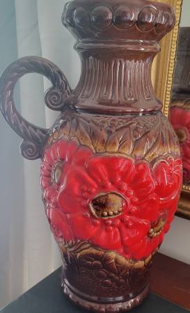 Scheurich Mid Century Modern vase with Handle. Decorated with poppies. Marked production #487-45., West Germany. Measures 17 1/2" high x 12" wide Very heavy Location Narragansett Cash $75 - OBO Cash...