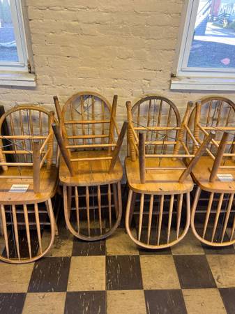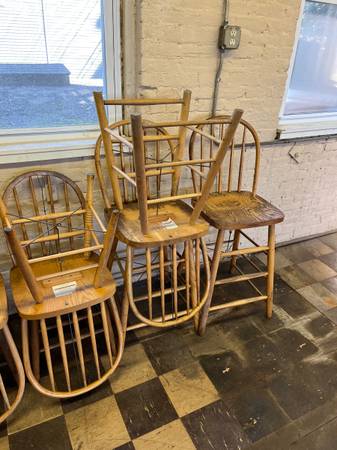 Windsor style wooden chairs possibly oak need good cleaning but otherwise in good condition $5 each call or text 508 two 7 two 2310