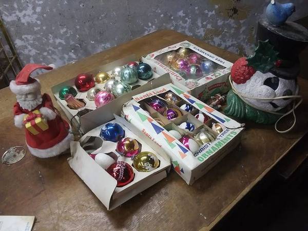 Vintage xmas decorations with a lighted Santa tree topper and a lighted snowman.