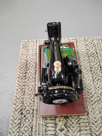 This antique Singer sewing machine in a carry case is being sold for $200. If interested, please call show contact info