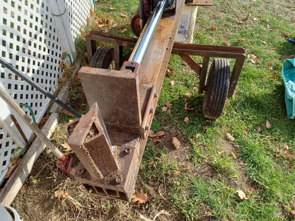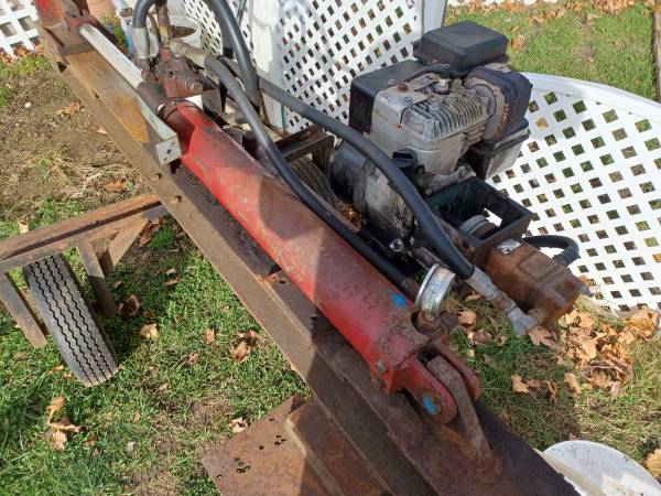 Home made log splitter Gas 5 Hp briggs straton has 17/8" trailer hitch for short trip towing. Built on heavy duty I beam, heavy duty 4" hydraulic piston 28" travel.Unknown on tonnage but very strong.Nothing held it back.