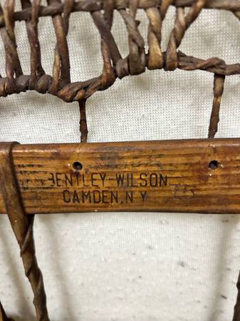 These antique, Bentley Wilson snowshoes are traditional wood snowshoes crafted in Camden New York United States during the mid-20th century. With the size of 58 x 10“, these vintage snowshoes feature a classic Athabaskan style in a rich brown color. The original Bentley Wilson brand adds to the Collectibles appeal, making them a unique and nostalgic addition to any decorative display. Made with quality materials and attention to detail, the snowshoes capture the charming craftsmanship of a big bygone era. No bindings and damage to a portion of one shoe.