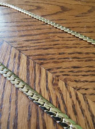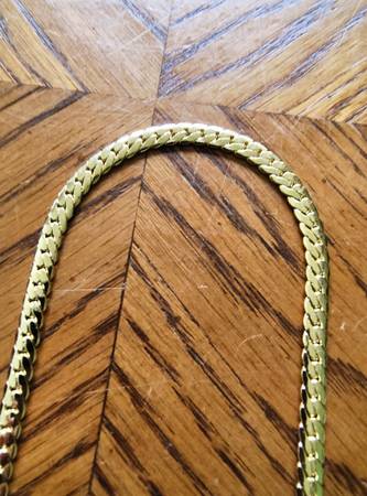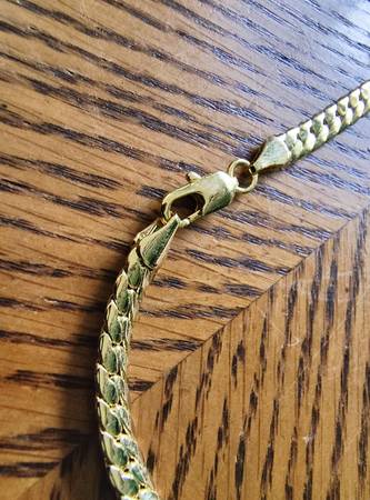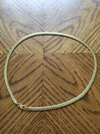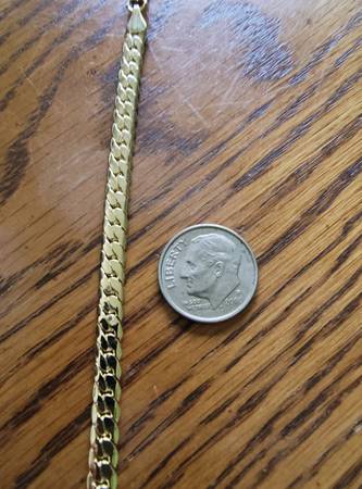 Bold and stylish yellow gold-tone chain necklace, measuring 18 inches long and 5mm wide with a sturdy curb link design and lobster clasp. This piece has a rich golden shine and a classic look that suits both casual and formal wear. Unmarked but has the appearance of 14K gold.