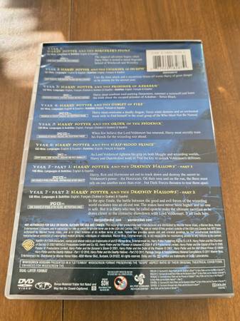 Complete 8-film Harry Potter DVD collection, includes all 8 discs in original case. Discs are tested and play properly. Case shows light shelf wear but overall in excellent condition. Enjoy the full wizarding world adventure from start to finish in one collection!