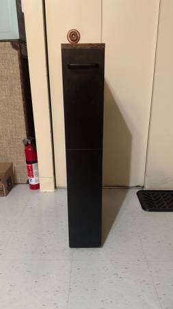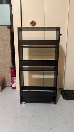 Slim storage car for kitchen or bathroom, or wherever. On wheels, with handle. Dimensions are 31” high and 5 1/2” wide.