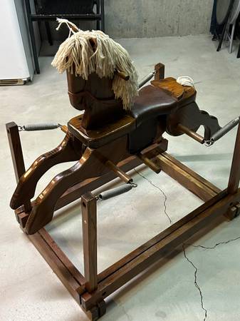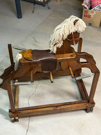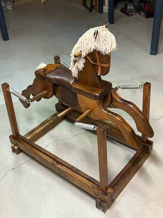 Children’s wooden riding rocking horse. 36" x 23" Safe, solid & sturdy, Clean & well-maintained,, Strong springs for hours of play. Perfect for Christmas !