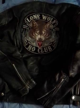 Men's Vintage Lone Wolf Leather Jacket The Liner is Beautiful NO RiPS ! Contact Debra if Interested: I also have (Size 44) Leather chaps with Fringe on the side (Size 44 ) for $60.00 Request Pic if...