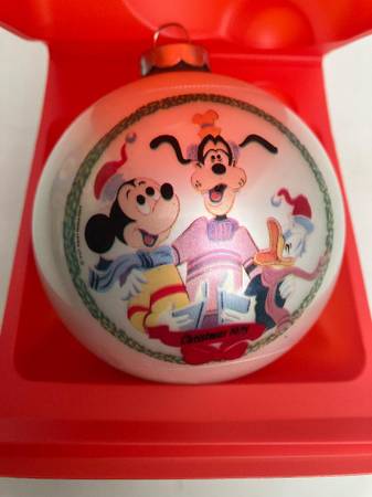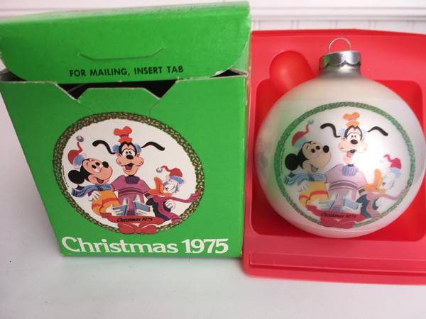 Celebrate 50 years with a Disney Mickey, Goofy and Donald 1975 Schmid Christmas ornament Mint in the original box.