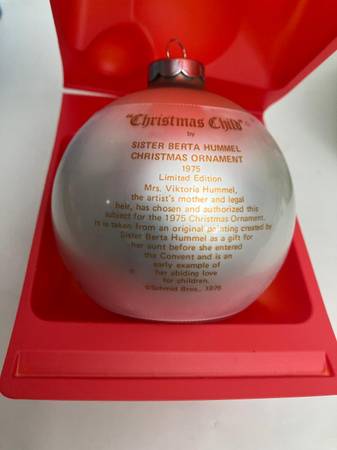 Also have 1975 Sister Bertha Hummel "Christmas Child" also in original box. Both of these are from a huge collection of never sold ornaments that were from a 1980 store closeout. $20 each. Contact me with a local cell number to arrange transaction!