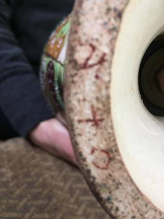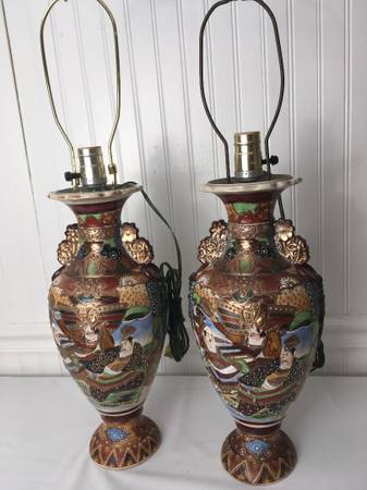These beautiful lamps are individually and painstakingly hand decorated and painted. Although they look identical, closer inspection will show the slight differences in the facial and clothing features and other design characteristics. Note that each has a signature on the bottom written in Kanji- but I haven't been able to decipher them to determine the maker. Please note the patina and ware on the bottom show a significant level of aging.