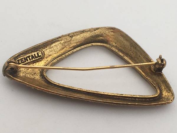 Vintage 1970's Zentall signed delta shaped pin/brooch. Stylized in ornate granular setting in brass/gold tone. 2.5"x 1.5" Contact me with a local cell number to arrange transaction. $35