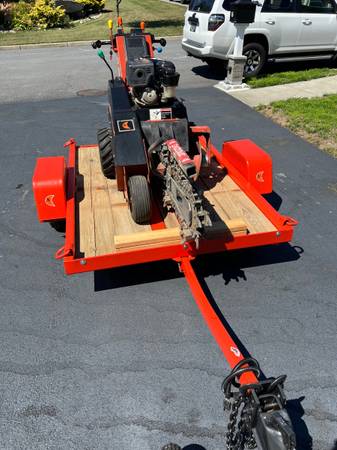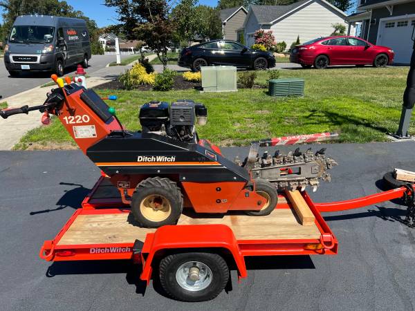 Ditch Witch 1220 Trencher with Heavy Duty Ditch Witch Trailer. Has full set of Shark Teeth (installed) and a full set of Alligator teeth (used once). Machine has always been homeowner use and garaged. Up to 36” depth with hydraulic controls. Comes with all the blade spacers, bolts, tools for adjusting, tools for changing teeth, Spare belts, etc.