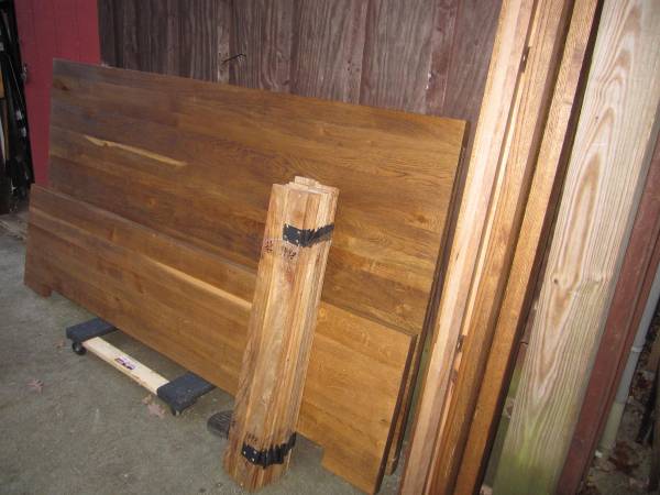 Oak king size bed. Headboard, footboard and side rails. $150 cash only. (Bundle of cross pieces in photo DO NOT belong with this bed) 85" wide x 45" high (headboard) x 81" long. 1499