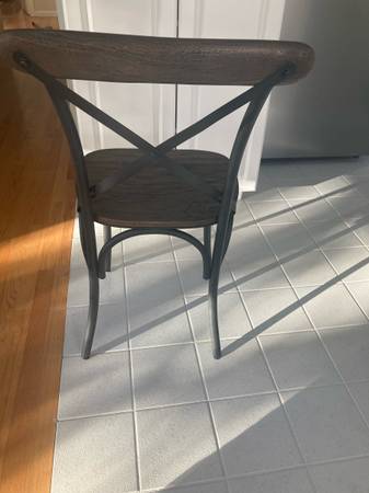 Six dining chairs custom made in North Carolina. Brand new condition. Industrial, rustic, contemporary. Hardwood seats have a hardwood back. Legs are steel with anti-scratch feet.