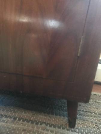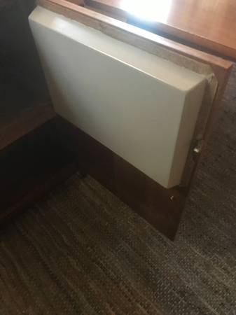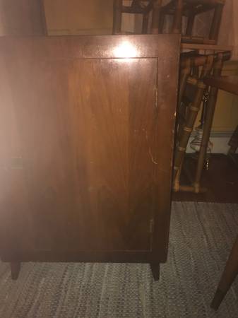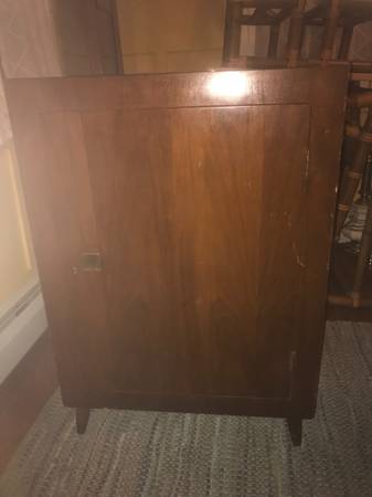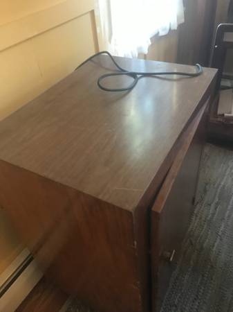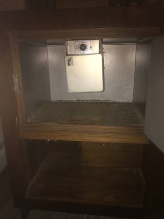 Penguin Mid Century Modern bar refrigerator as shown. It does not work. The coils are simply clipped on the back and the compressor is mounted in an opening on the back so it doesn't look like a lot of labor would be involved in replacing it. I have seen similar modern compressors on line for less than 150$ new .Other than not working piece is in pretty good shape and fairly rare find for your mid century decor. The interior in the cold area is a galvanized metal that has a little surface rust. Exterior is a veneer which has some small chipped pieces and scratches. Overall it looks good and for a couple hundred bucks could be up and running.