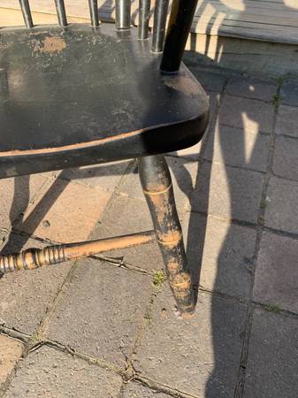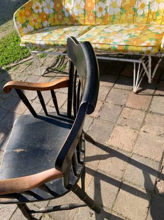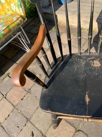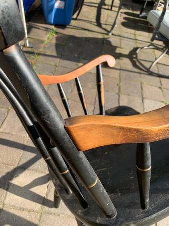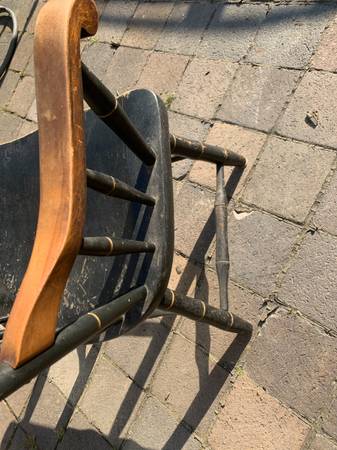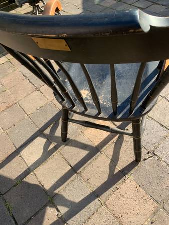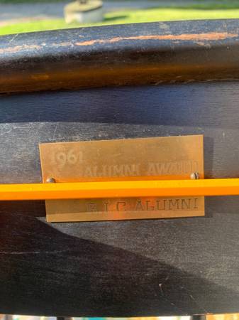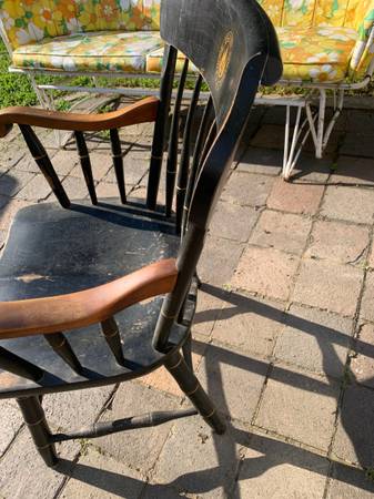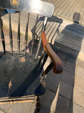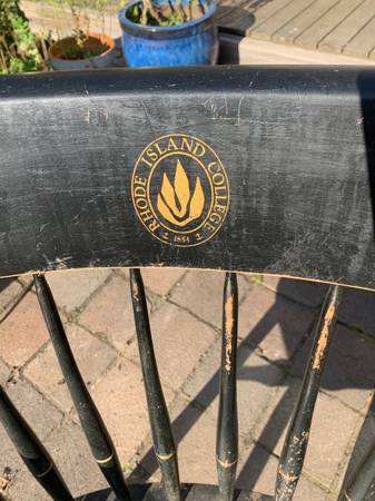 Library armchair with the crest of Rhode Island College. Chair was a 1961 presentation piece to an alumni and I have covered their name. Piece is in fair condition and needs some cleaning up. The black finish is worn as shown. One of the seat seams has a little gap, not loose, but there is a tiny gap. It needs a little cleaning up but overall pretty good condition.