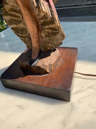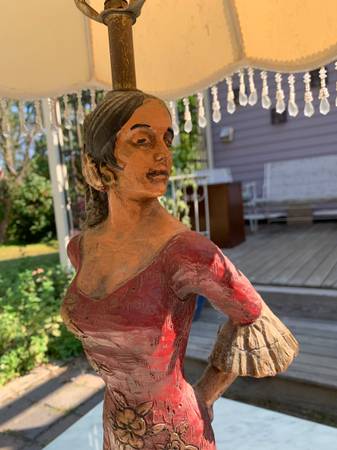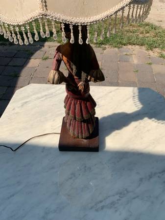 Vintage Flamenco dancer lamp. I think it is some sort of cast resin. Piece is in very good used condition. There are several small nicks to the color. The metal and the base have some scuffs and nicks. I plugged it in and it works, however it looks like the original (old) wiring. Shade is has a few small tears and is a little dirty. Piece has a few little scuffs but overall excellent condition.