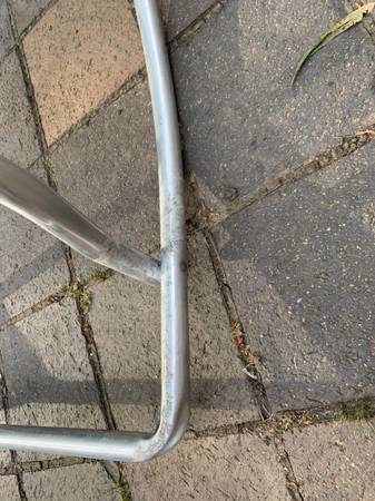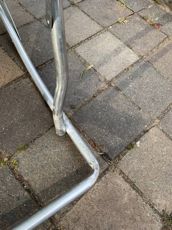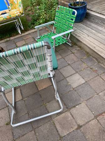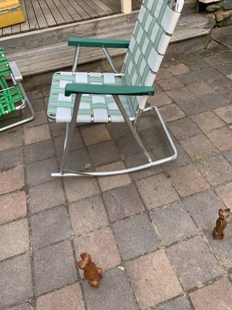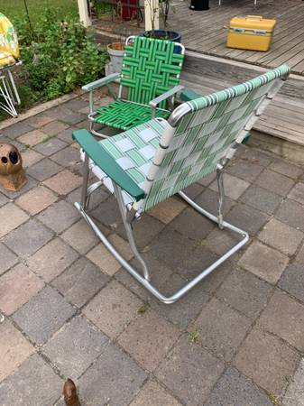 Webbed aluminum folding rocking chair with plastic arms. Piece is in very good condition. Aluminum has a tarnished area near the legs. Previous owner had taped several together and it left some residue. Aside from the tarnish piece is in excellent condition.