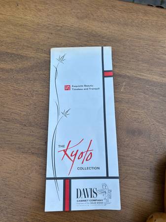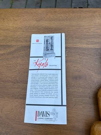 Mid Century Kyoto by Davis Asian influence credenza. Piece is excellent used condition. The original sales brochure was inside the drawers. There are some areas on the top and side where the finish is worn / lighter than the rest. There are some scratches shown next to the quarter for scale. Interior drawers and shelves are excellent. Shelves are removable. Carved doors and brass pulls are excellent. Piece needs a little cleaning up but overall excellent condition.