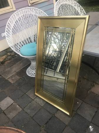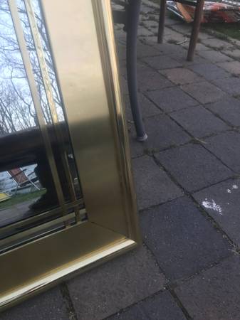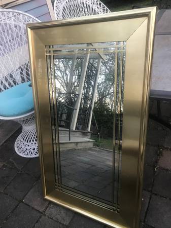 Vintage Autumn Guild decorative mirror. Piece is marked with the original label. Mirror is in good used condition. Brass has some tarnished areas as shown in the photos. A thorough cleaning would help but some may be permanent. There are a few small dents to the brass trim. Edge of frame has some scratches to the color. It was made with hanger attachments on all four sides so it can be hung in either direction. Aside from the obvious tarnish piece is in pretty good condition.