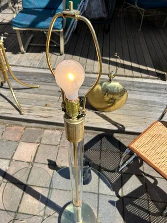 Vintage brass and glass column / tube floor lamp with built in glass table. Other sellers attribute this to Paul Hansen but it is not marked. Lamp is in good used condition. The brass finish is a little worn. Be sure to zoom in on the base as some of the tarnished spots will clean up and polish well but I think some of it will not. I bought some brass refinish polish and may attempt it on this piece if the color matches. Lamp works as shown in the photos. Metal has some scuffs and scratches it is otherwise pretty good.