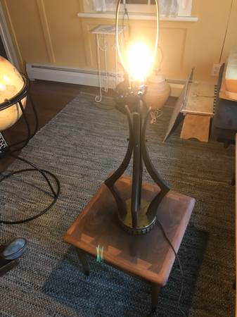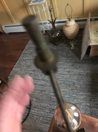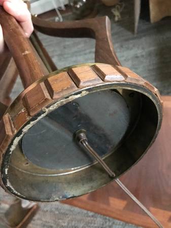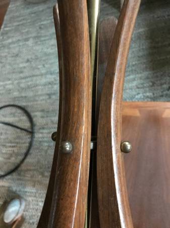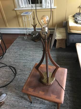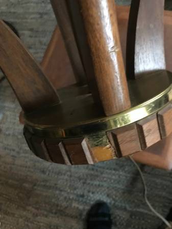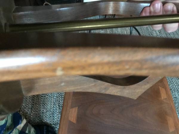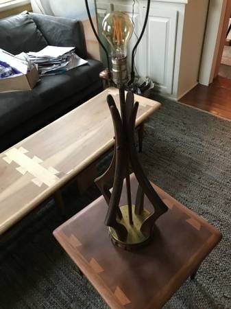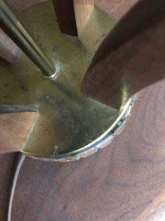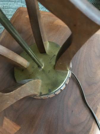 Mid-century / Danish Modern walnut table lamp. lamp it is not marked. Piece is in good used condition. Brass has some damaged tarnished psots. The wood trim around the base is missing 2 little squares. You could perhaps take the two from either side of the cord as these would be towards the back anyway. There are some slight scuffs and scratches to the wood but overall pretty good condition. It works as shown in the photos and wiring seems fully intact but wiring is original and old.