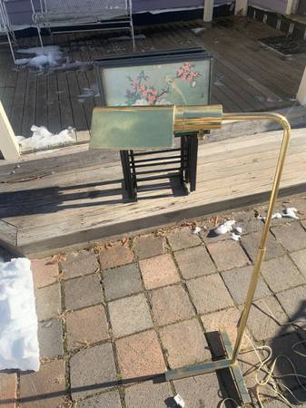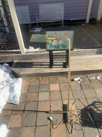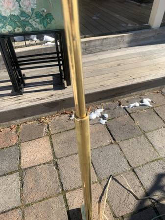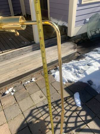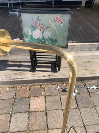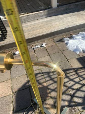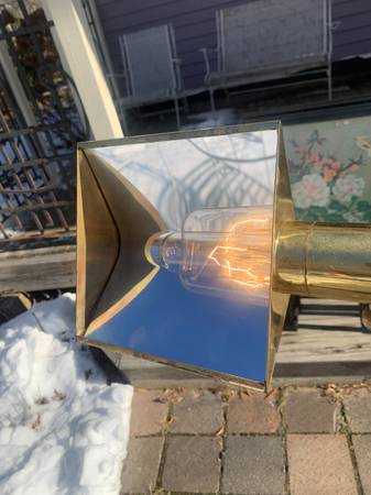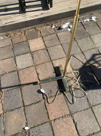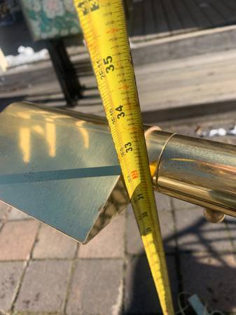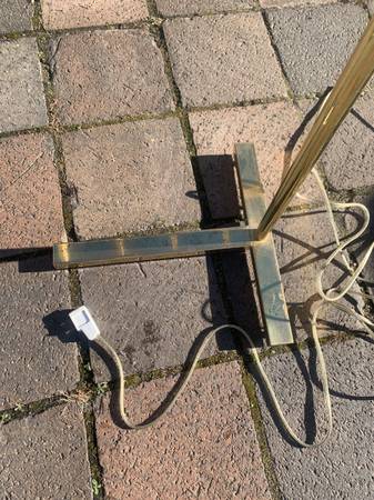 Mid Century brass floor lamp by Jon Norman for Casella. I couldn't find any markings but I see a number of them online with just a paper label. Lamp is in very good used condition. The brass finish is a little worn / tarnished, most of this will clean up and polish quite well but it is tarnished. Lamp works as shown in the photos. When I fully extend it, it leans a little forward, not sure if there is an adjustment I am missing. Metal has some slight scuffs and scratches it is otherwise very good.