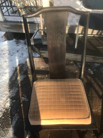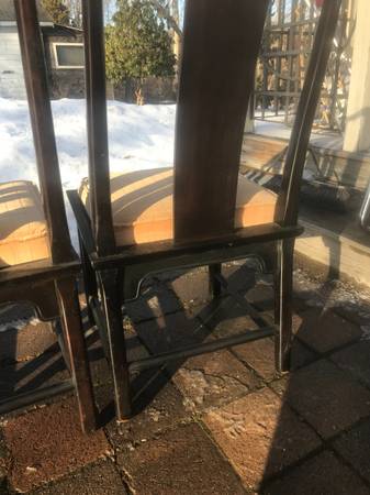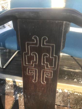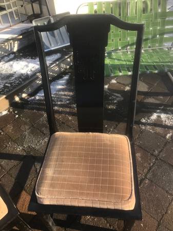 3 Asian inspired dining chairs from the Chin Hua collection by Century Furniture Co.. Set is in very good condition. Edges have some scuff marks from bumping walls and other furniture. Seats are a little worn and dirty but should be presentable with a little cleaning. Wood has some scuffs and scratches but overall excellent condition.