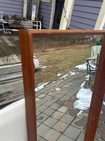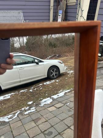 Vintage, teak, Danish modern mirror by Spejle Denmark. The mark is shown but a little blurry. Mirror is in excellent condition. It was standing on a floor and that side is a little scuffed up. It is the side with the hanger hook so it would be up top if you hung it. The finish has some slight nicks and scratches but otherwise piece is in excellent condition.