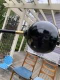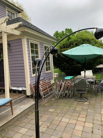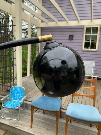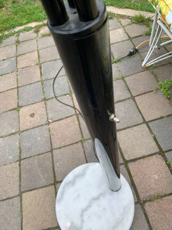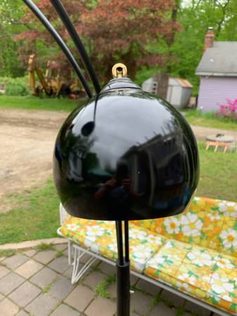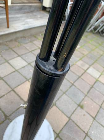 Guzzini style 3 light arc light with large marble base. A number of designers and manufactures produced these but it has no markings. It is a 3 way switch and all the lights work. The arms are adjustable so you can splay them out as much as you want. The plastic cap is a little loose where it enters the metal cylinder but I assume you could tighten this from the bottom. Finish has some scuffs and scratches but overall excellent condition.