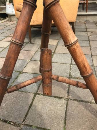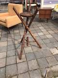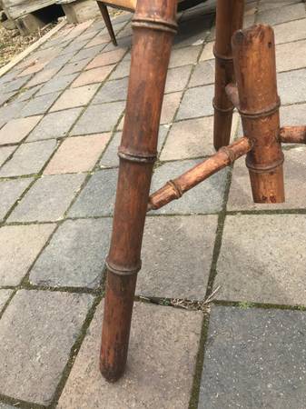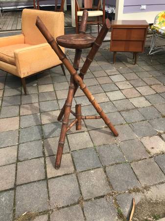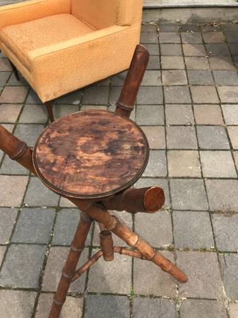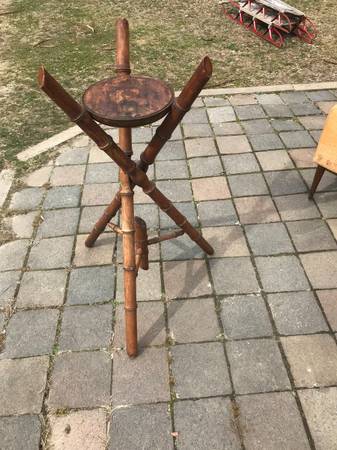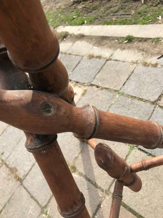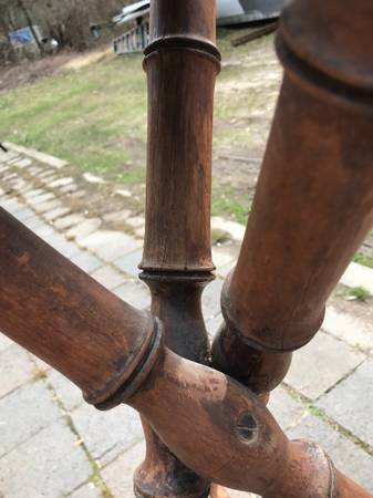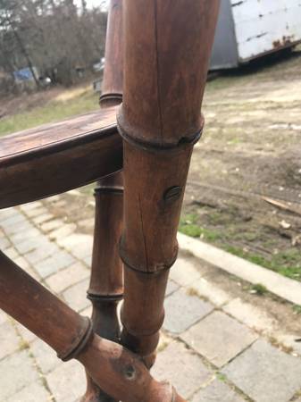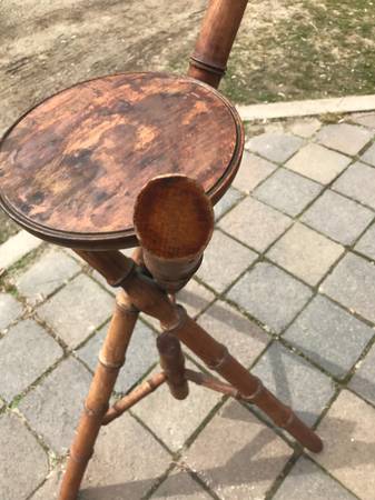 This has the Late Victorian early 1900's Faux Bamboo look to it, but it is turned hardwood. The others I see online have a sort of handle attachment and there is a little spot on these where there was perhaps a screw. Aside from the possibly missing pieces stand is in great shape. Wood has a few little chips and nicks but overall very good.